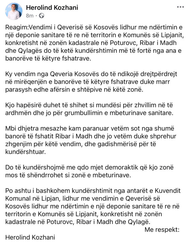 Asambleisti i PDK-së në Lipjan, Herolind Kozhani  ka kundërshtuar vendimin e Qeverisë së Kosovës lidhur me ndërtimin e një deponie sanitare të re në territorin e Komunës së Lipjanit, konkretisht në zonën kadastrale në Poturovc, Ribar i Madh dhe Qylagës
