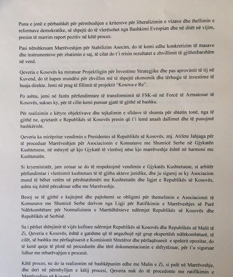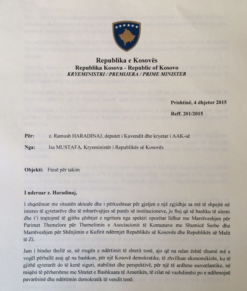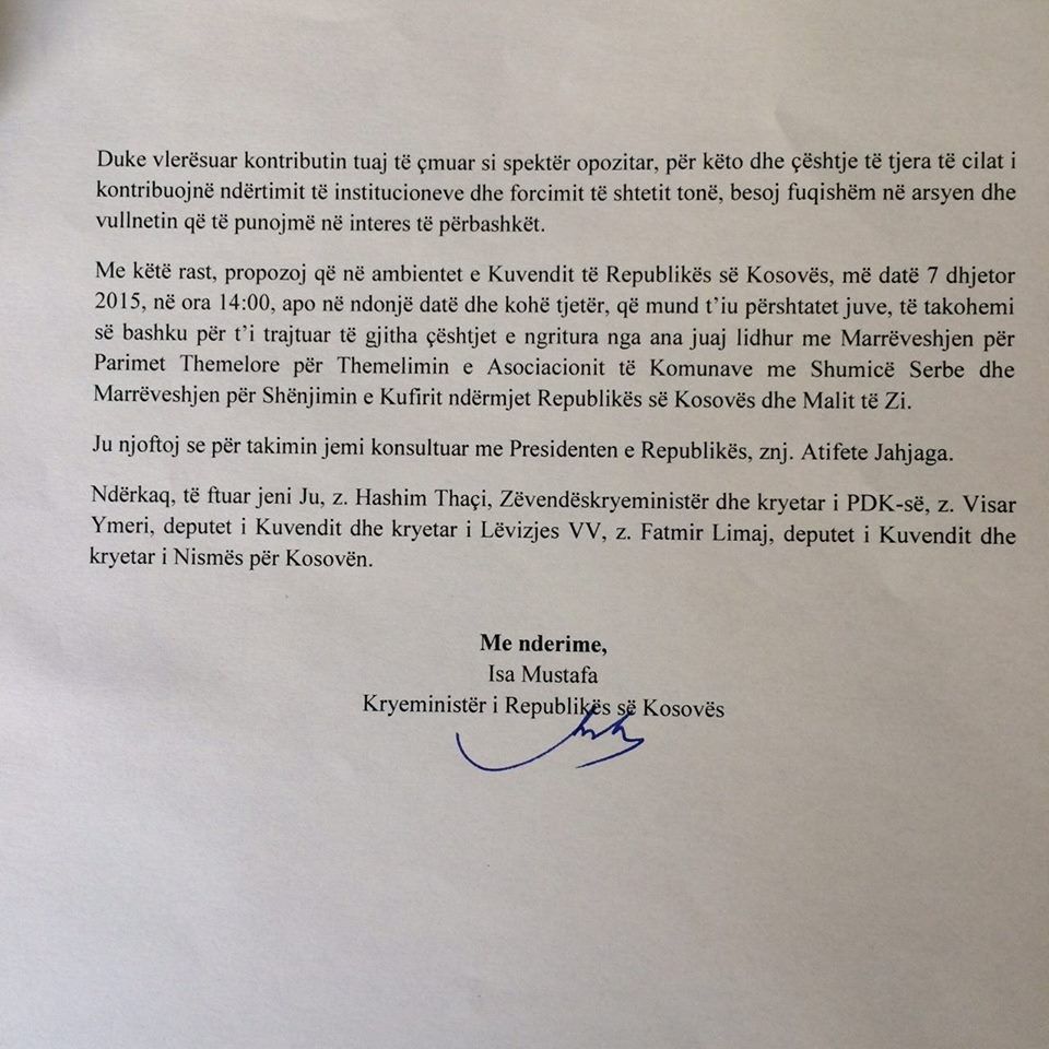 Më poshtë mund ta lexoni ofertën zyrtare të kryeministrit Mustafa drejtuar partive opozitare. /Klan Kosova/