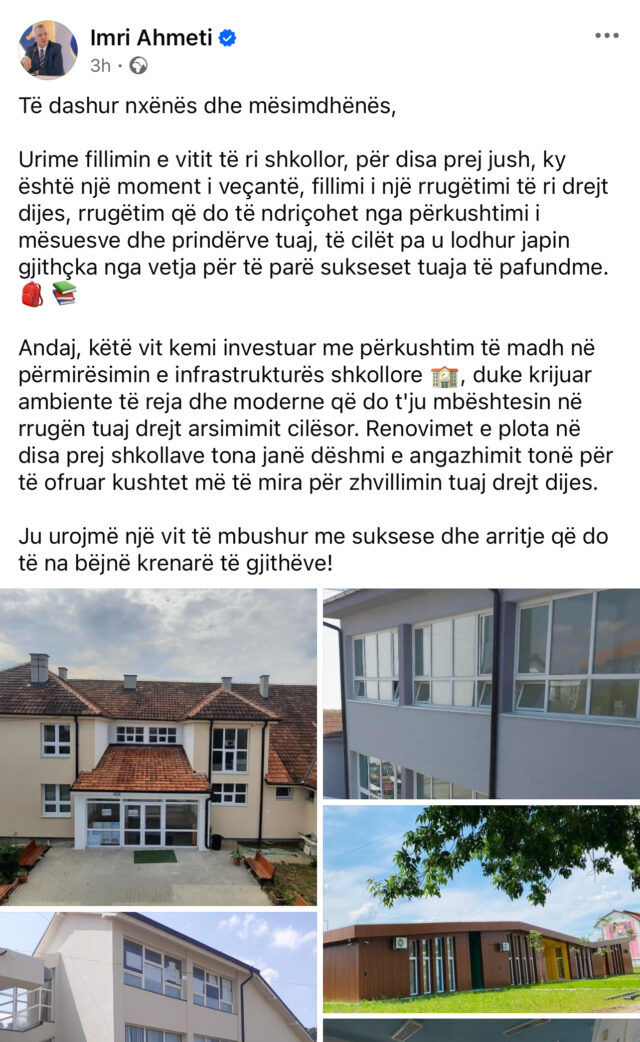 Urime fillimin e vitit të ri shkollor, për disa prej jush, ky është një moment i veçantë, fillimi i një rrugëtimi të ri drejt dijes, rrugëtim që do të ndriçohet nga përkushtimi i mësuesve dhe prindërve tuaj, të cilët pa u lodhur japin gjithçka nga vetja për të parë sukseset tuaja të pafundme. 🎒📚