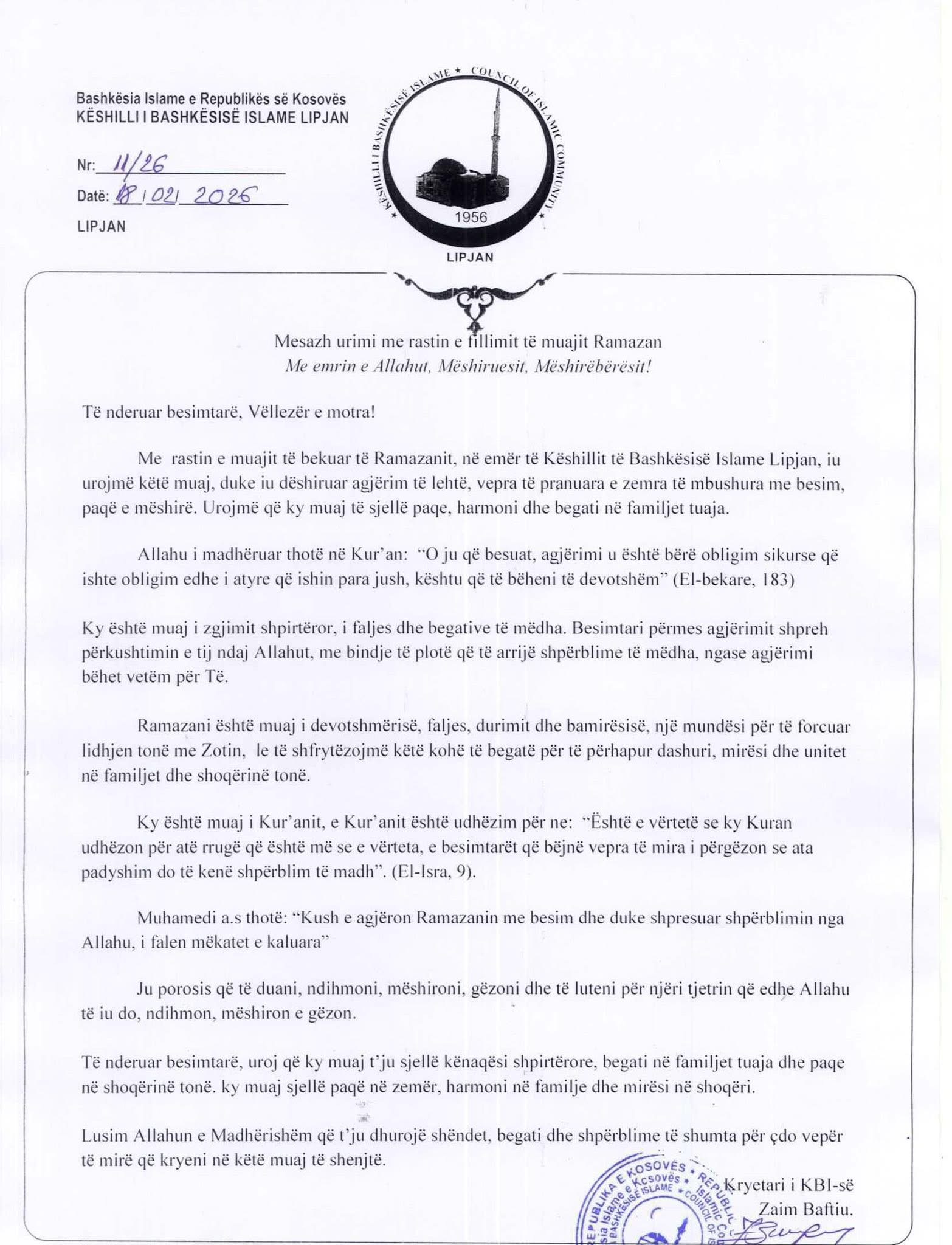 Mesazh urimi me rastin e fillimit të muajit Ramazan nga Kryetari i KBI-së Zaim Baftiu