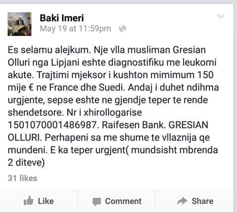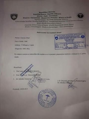 Ndihmojeni Gresianin nga Lipjani, ai ka nevojë për ju (Foto) PUBLIKUAR 21/05/2015 LipjaniNews.com Gresian Olluri nga Lipjani është diagnostikuar me leukemi akute. Trajtimi i tij mjekësor kushton, minimalisht 150 mijë euro. Sipas familjarëve, atij i duhet ndihma urgjente, sepse është në gjendje tepër të rëndë shëndetësore. SHIKO MË SHUMË LIPJANI Pesëvjeçari nga Lipjani në gjendje stabile, lirohet nga QKUK, merret nga QPS në Gjakovë Fëmija pesëvjeçar nga Janjeva e Lipjanit, i cili u keqtrajtua nga prindërit e tij,... 16/04/2026 LIPJANI Vdes Drejtori i HANDIKOS Lipjan Afrim Mena Kryetari Komunës ka ngushëlluar familjen Mena me rastin e ndarjes nga jeta të Drejtorit... 13/04/2026 LIPJANI Lipjan: I gjendet një armë zjarri në veturë, shoqërohet në stacionin policor një person Arrestohet një person në Lipjan, pasi që gjatë kontrollit në veturën e tij është... 01/04/2026