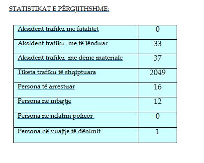 Sipas policisë, gjatë kësaj periudhe kohore janë evidentuar disa aksidente në trafikun rrugor, ku 33 aksidente kanë qenë me lëndime, ndërsa 37 me dëme materiale.