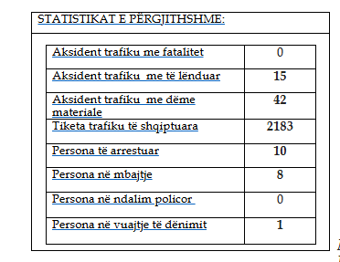 Në raport theksohet edhe se gjatë kësaj kohe kanë ndodhur 42 aksidente me dëme materiale, dhe 15 me të lënduar.