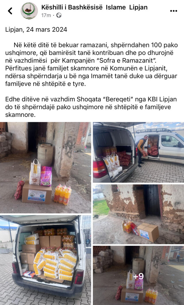 KBI në Lipjan ka njoftuar se në këtë ditë të bekuar ramazani, shpërndahen 100 pako ushqimore.