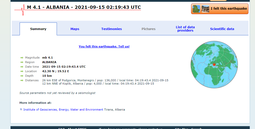 Thellësia sipas informacioneve të dhëna ishte 10 km teksa lëkundjet janë ndjerë me të madhe në Mal të Zi.
