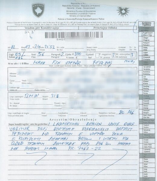 “Policët e Njësisë së Komunikacionit Rrugor me datën 12.03.2024 rreth orës 21:52 në rrugën magjistrale Ferizaj-Kaçanik, në Fshatin e Vjetër të Ferizajt kanë ndaluar shoferin S.G (M/K) i moshës 21 vjeçar, i cili me veturë ka bërë tejkalimin e shpejtësisë, ku në zonën e kufizimit 80 km/h ka zhvilluar shpejtësi 146 km/h. Ndaj tij policia i shqiptoi një gjobë kundërvajtëse sipas ligjit të komunikacionit rrugor me dënim 300 euro, 3 pikë negative dhe 3 muaj masë mbrojtëse, heqje e patent shoferit.”